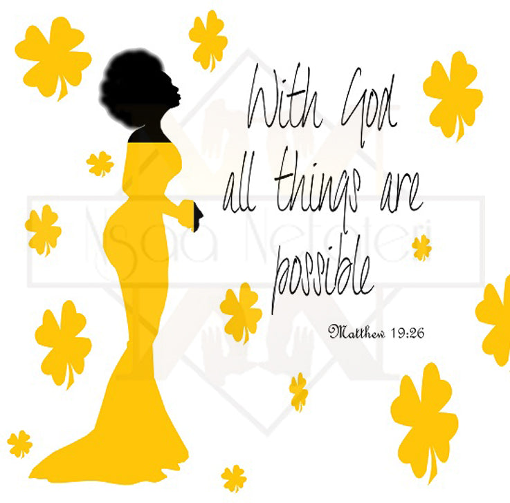 This elegant Nsaa Nefateri card features a striking silhouette of an African-Caribbean woman in a flowing golden gown, surrounded by soft floral accents. The words “With God all things are possible” (Matthew 19:26) are beautifully finished in shimmering gold foil, adding a touch of grace and reverence to the design.