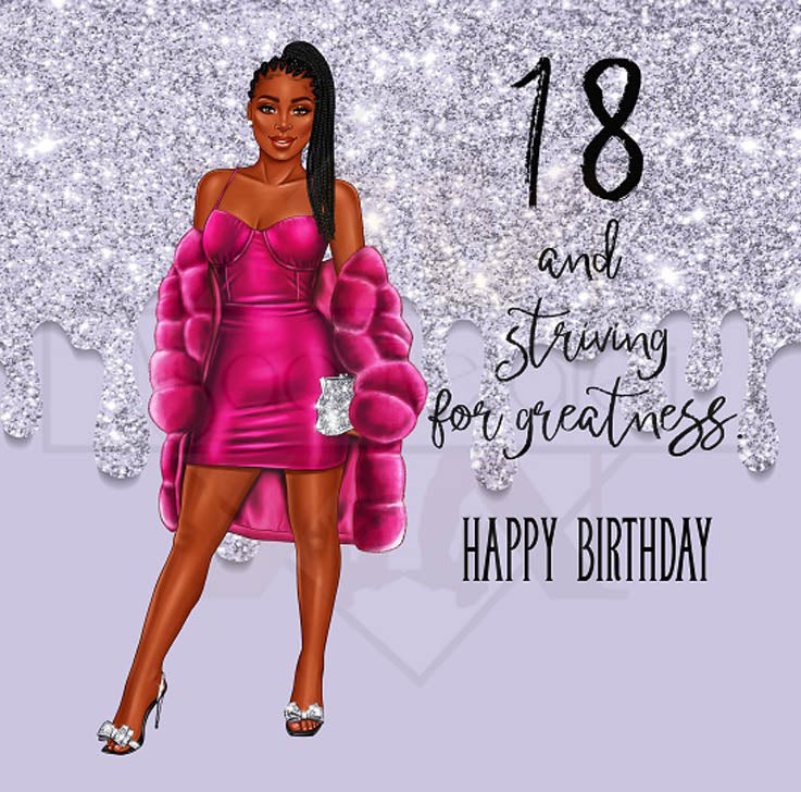 Turning eighteen is more than a birthday — it is a doorway. A moment where childhood gently steps aside and possibility stands waiting. This Afrocentric 18th birthday card celebrates a young Black woman stepping confidently into her future, wrapped in style, strength and self-belief.