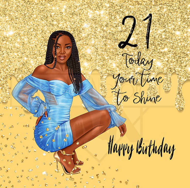 This Afrocentric 21st birthday card celebrates that shine. Draped in gold and dressed in soft blue elegance, she represents poise, ambition and the quiet strength of a woman coming into her own. This design honours Black beauty, milestone growth and the courage to stand tall in your light.