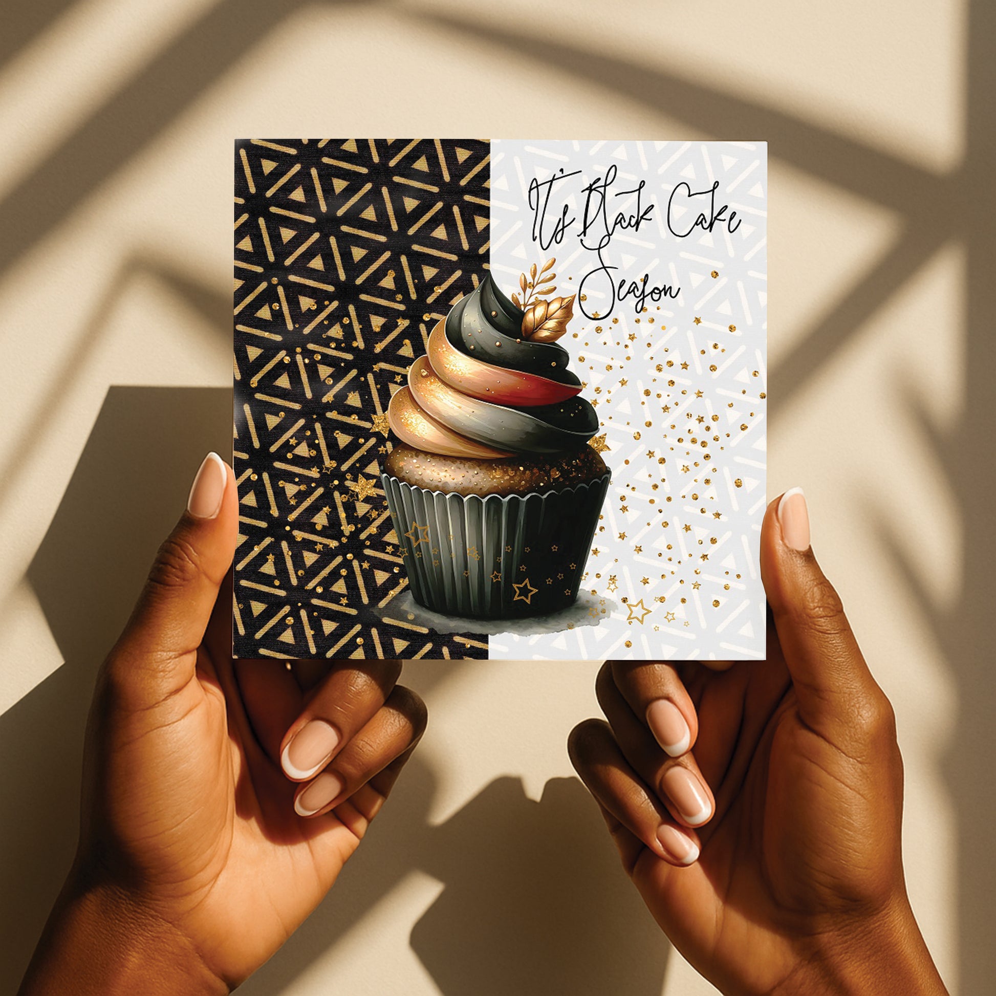 The It’s Black Cake Season card by Nsaa Nefateri honours the dessert that brings every Caribbean Christmas table to life — rich, deep, spiced Black Cake. This luxe cupcake illustration carries that familiar warmth and island decadence we grew up on — blended with gold glimmers, modern Afrocentric pattern, and the unmistakable beauty of Christmas in the diaspora.