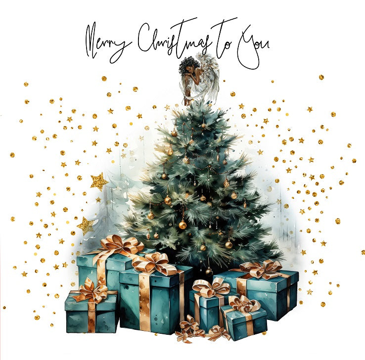 Soft, elegant, and full of festive magic — this design captures the warmth of Christmas in the most beautiful way. A lush evergreen tree stands proudly, dressed in golden ornaments, while an angel with natural curls and gentle wings watches over from above. Wrapped gifts in rich teal and gold add a luxurious touch, making the whole scene feel like a moment of pure joy.