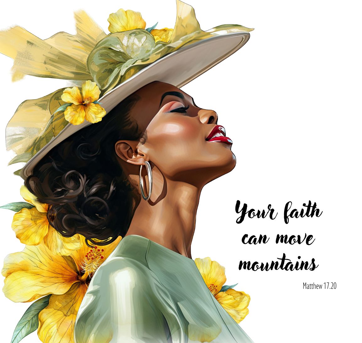 The Move Mountains card by Nsaa Nefateri captures a moment of spiritual strength and divine elegance. Featuring a radiant African-Caribbean woman in a wide-brimmed hat adorned with golden blooms, this illustration beautifully embodies faith, beauty, and confidence in God’s promises.