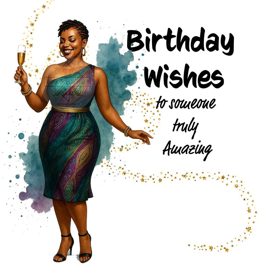 This Birthday Wishes card by Nsaa Nefateri celebrates the woman who carries grace and joy in every step. With her elegant short locs, warm smile, and sparkling energy, she embodies the beauty of self-love and ease. Dressed in a stunning one-shoulder African print dress with rich jewel tones, she raises her glass to life, laughter, and all that’s yet to come.