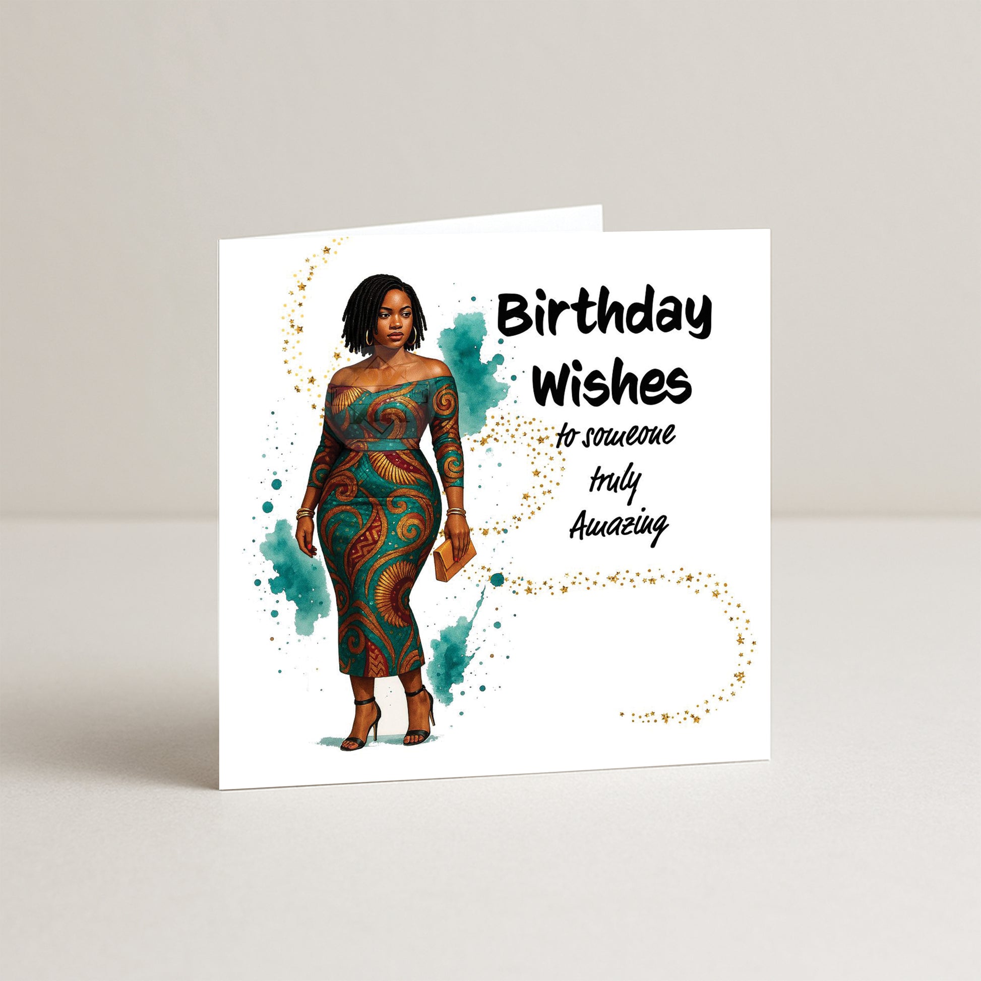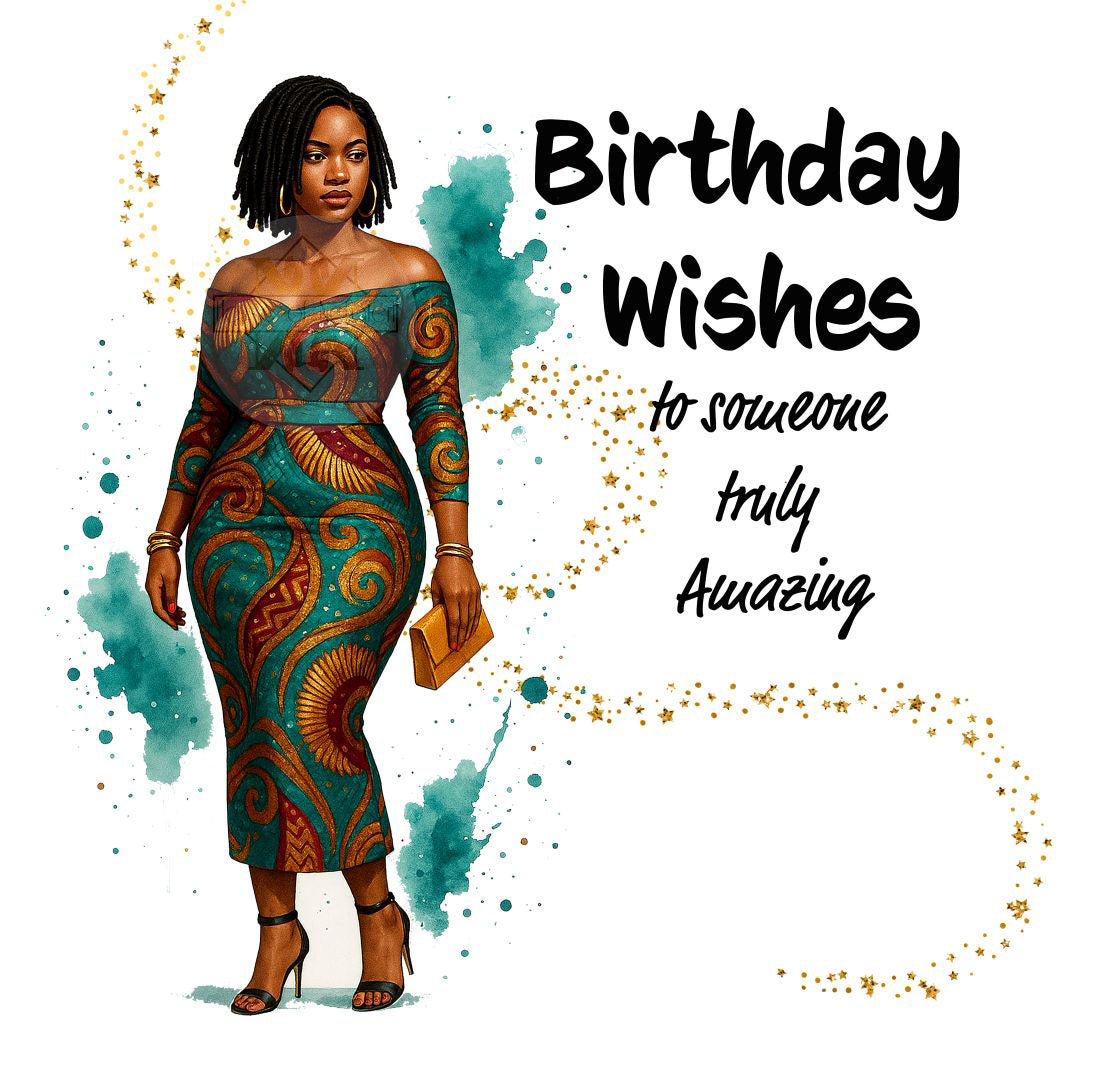 Celebrate the essence of elegance and culture with this Afrocentric birthday card featuring a poised Black woman with shoulder-length locs, dressed in a stunning teal and gold African print bodycon dress. Her confident stance and graceful expression embody sophistication and power, making this the perfect card for a queen who shines with quiet strength.