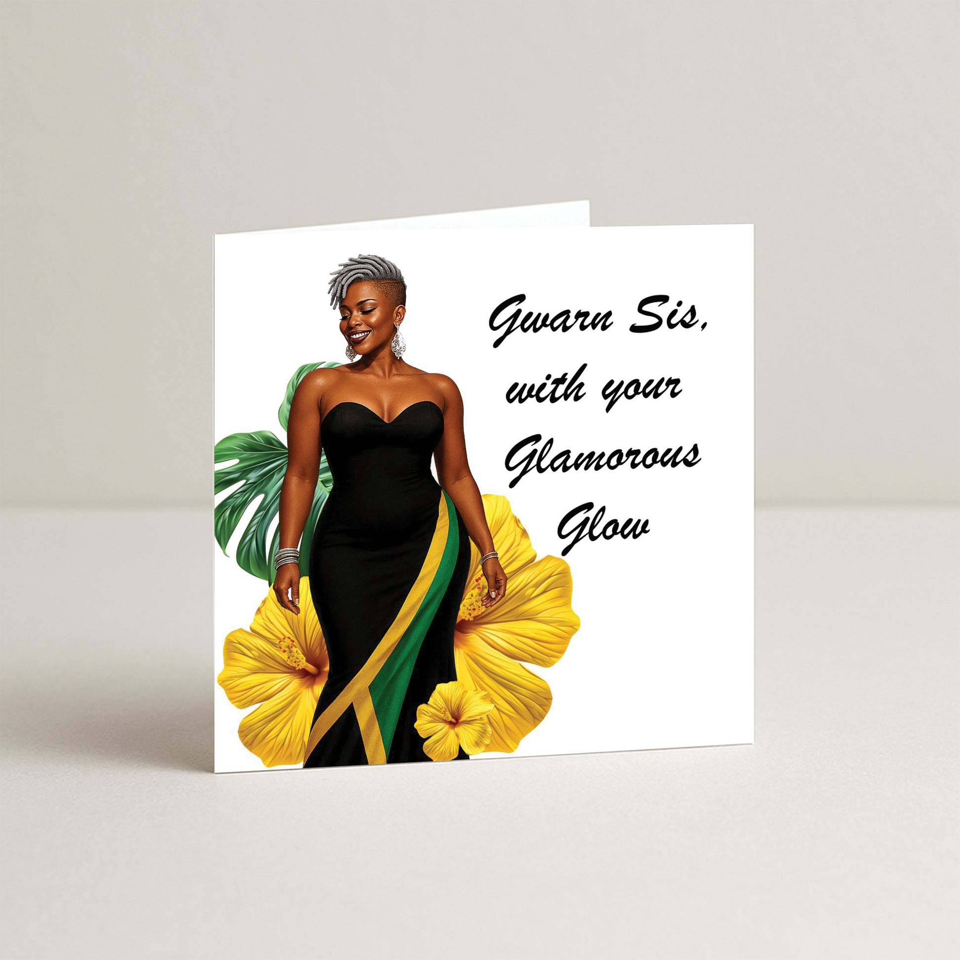 The Gwarn Sis card by Nsaa Nefateri celebrates sisterhood and confidence with vibrant Caribbean flair. Featuring a radiant African-Caribbean woman glowing in a black gown inspired by the Jamaican flag, surrounded by golden hibiscus blooms, this design radiates pride, beauty, and effortless style.