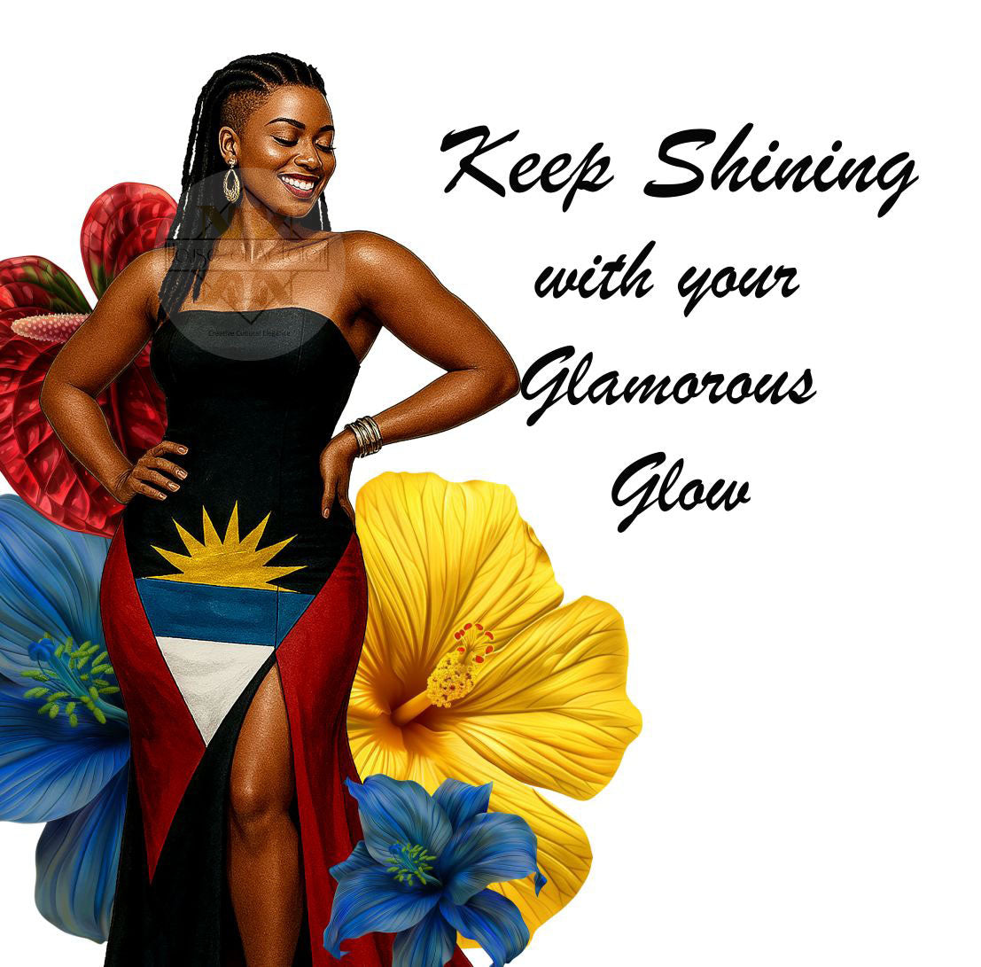 The Island Locks Antigua – Keep Shining card by Nsaa Nefateri celebrates the beauty, strength, and vibrant spirit of Caribbean women. Featuring an elegant African-Caribbean woman in a sleek black gown adorned with the red, blue, and gold of the Antiguan flag, this design embodies the warmth and confidence of island life.