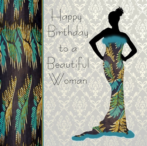 The Aysis Beautiful Woman card by Nsaa Nefateri celebrates the radiance and confidence of the modern African-Caribbean woman. Dressed in a graceful Afrocentric gown adorned with teal, gold, and earthy patterns, this silhouette design captures timeless beauty and effortless sophistication.