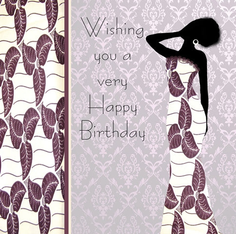 The Nia birthday card by Nsaa Nefateri is a celebration of grace and timeless beauty. Featuring an African-Caribbean silhouette dressed in a stunning gown of soft plum and ivory African print, this design radiates sophistication and quiet strength.