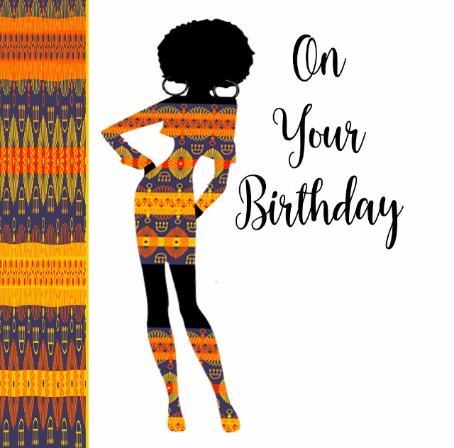 The “Sunshine Girl” birthday card by Nsaa Nefateri celebrates the vibrant energy of the African-Caribbean woman who lights up every room she enters. Her striking silhouette, wrapped in vivid African print patterns of gold, orange, and indigo, captures confidence, joy, and that unmistakable Black girl magic.