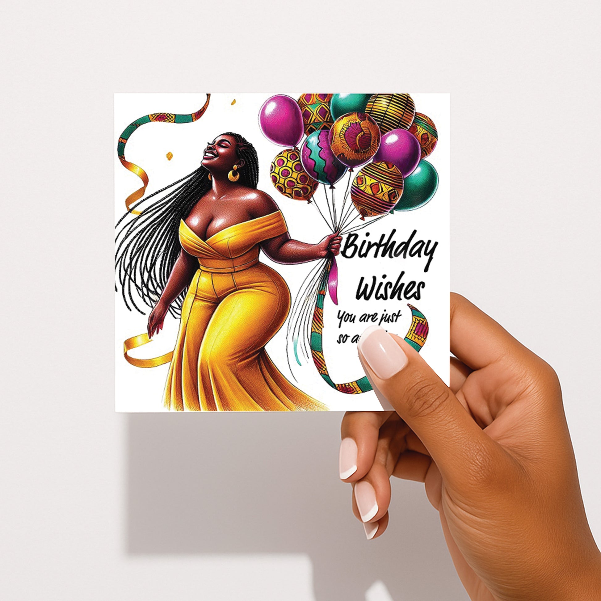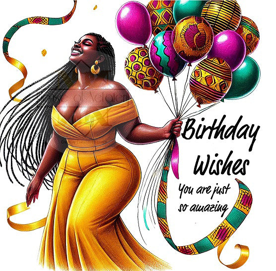 This joyful Afrocentric birthday card shines with warmth and celebration. It features a stunning Black woman in a vibrant yellow off-shoulder jumpsuit, her long braids flowing as she walks with pure confidence. She holds a bouquet of colourful balloons wrapped in bold African print patterns — a lively, uplifting design perfect for someone who brings light wherever they go.