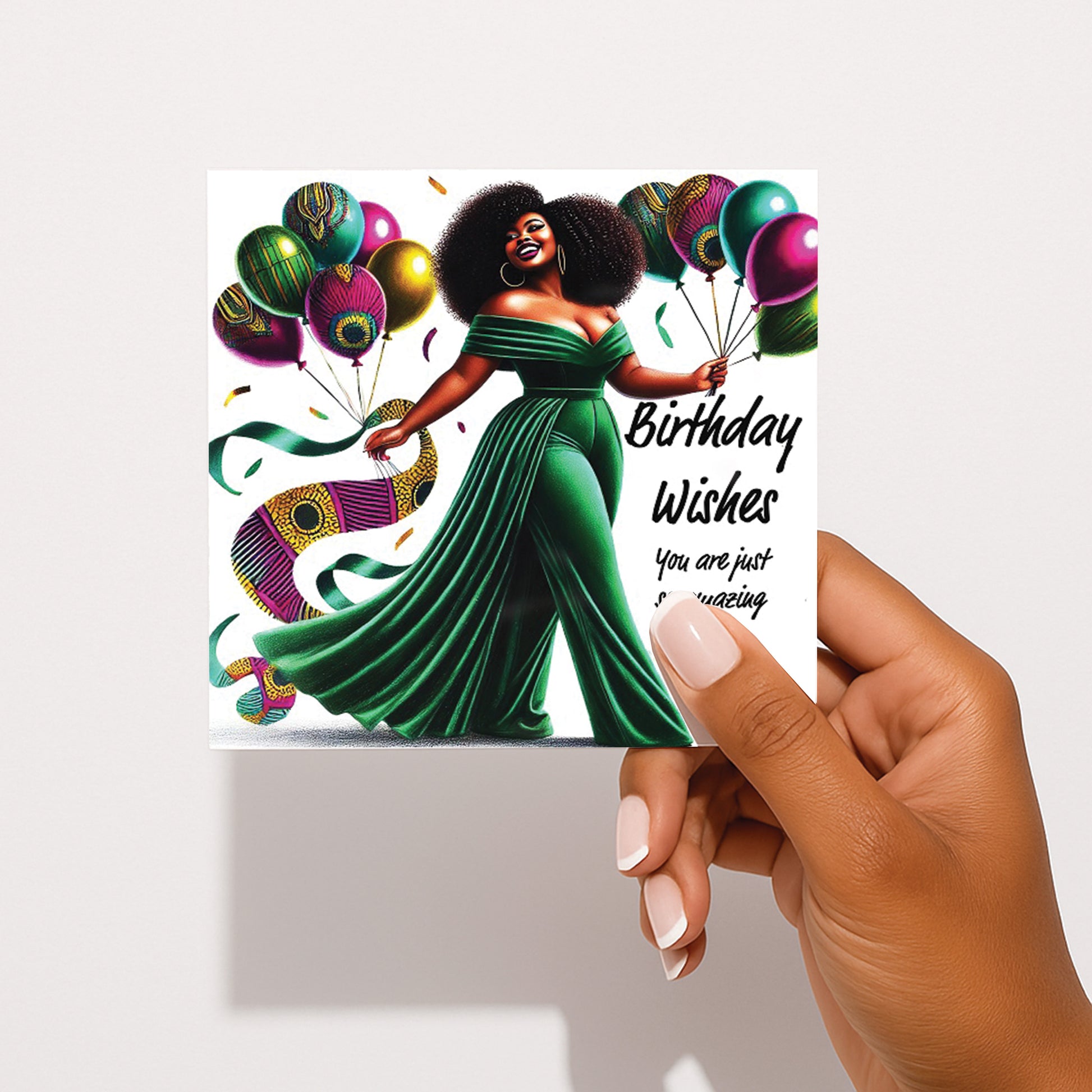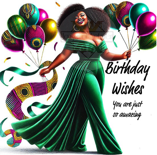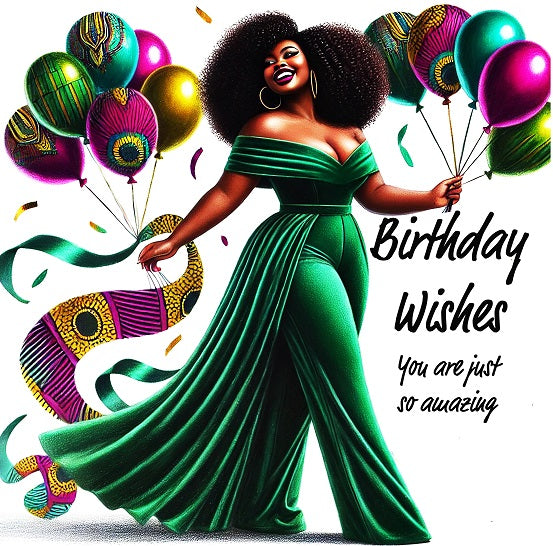 This vibrant Afrocentric birthday card celebrates joy, confidence, and pure Black girl magic. The design features a stunning Black woman in an elegant deep-green jumpsuit with a flowing overskirt, holding bold African-print balloons and radiating pure celebration. A perfect greeting for someone who deserves to feel lifted, seen, and appreciated.