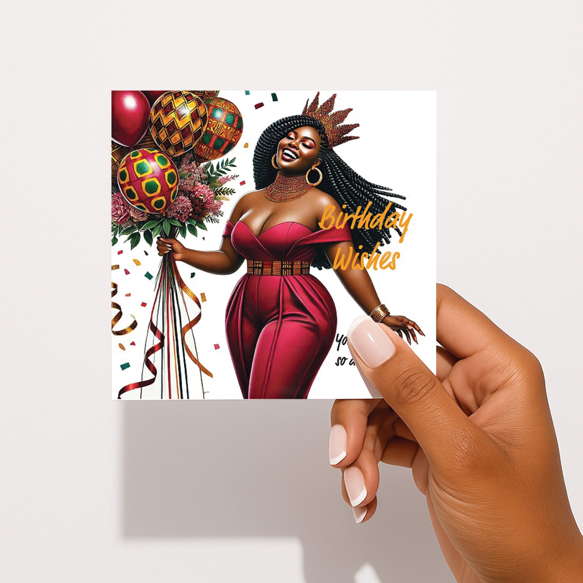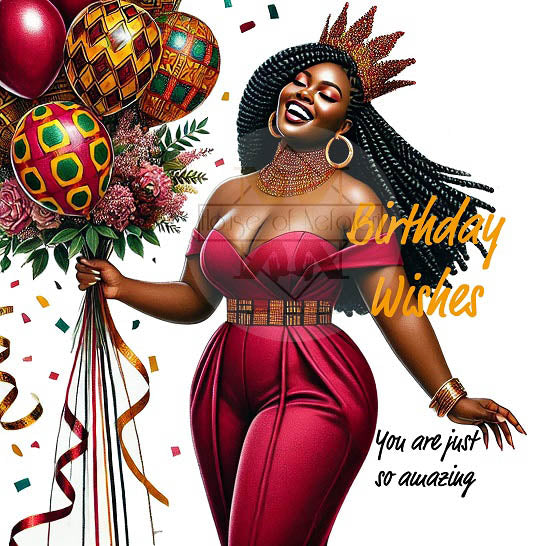 The design features a stunning Black woman crowned in gold, her long braided hairstyle flowing with confidence and grace. Dressed in a rich, deep-red jumpsuit with elegant African-inspired detailing at the waist, she stands in full celebration mode — holding a vibrant bouquet of balloons wrapped in beautiful African print patterns.